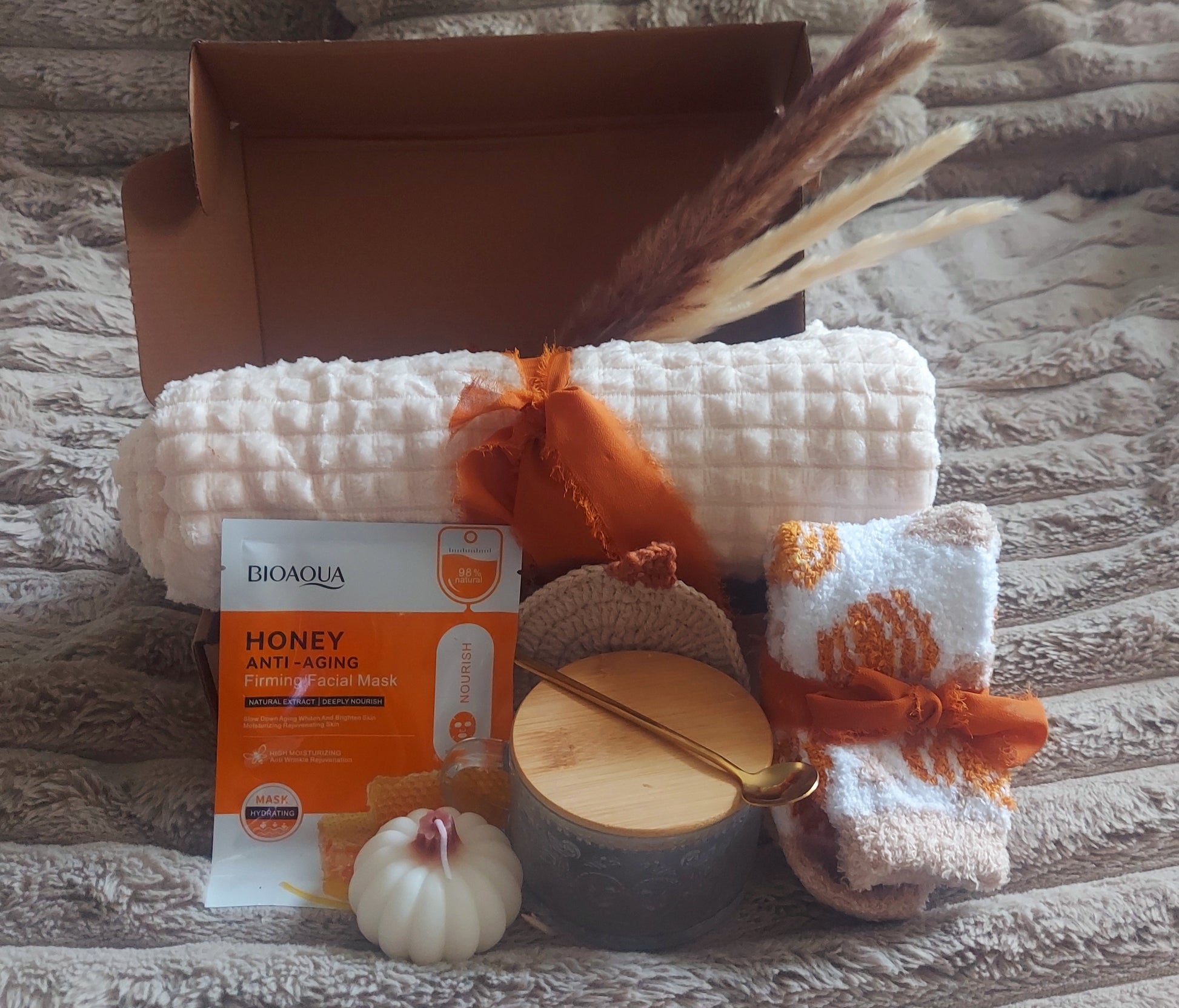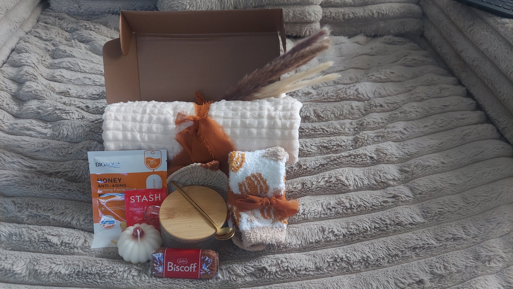 Looking for the perfect cozy gift box? Our Cozy Mystery Box includes everything needed for relaxation and comfort: a soft blanket, fuzzy socks, glass mug, scented candle, tea, cookies, and a coaster.